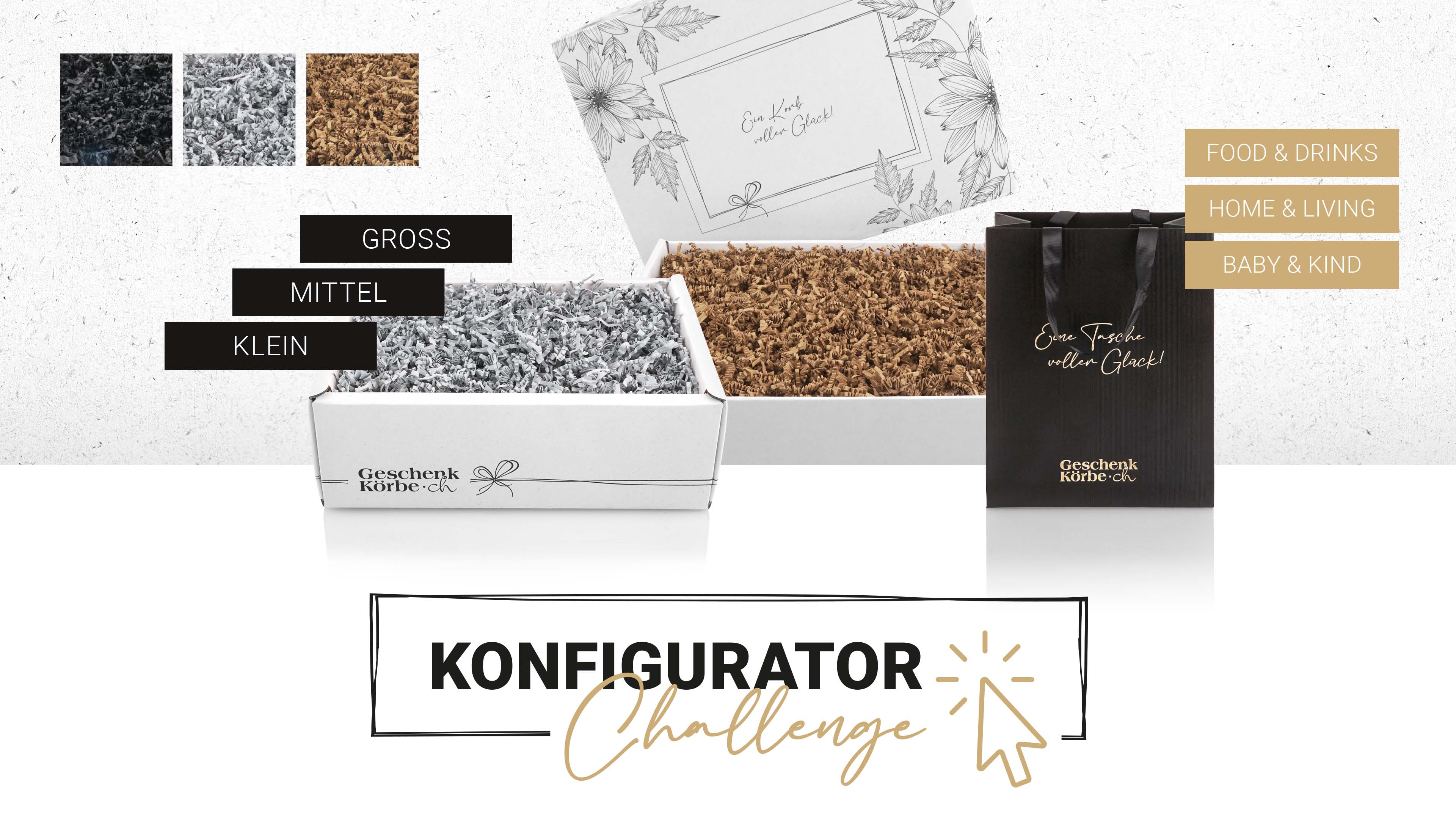 Wähle zuerst die Art des Korbes aus. Klicke auf eine Verpackung und bestimme die gewünschte Grösse und die Farbe des Füllmaterials. Die Konfiguration kann später noch verändert werden.